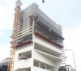 Para su construcción se ha planteado una solución creativa de encofrado y apeo, adaptada perfectamente a las necesidades de la obra. Se ha utilizado cerca de 2.000 m2 de ENKOFORM VMK para los muros y 1.200 m2 para losas, cada 2 plantas. Se ha cumplido así con las geometrías y los patrones diseñados por el arquitecto.