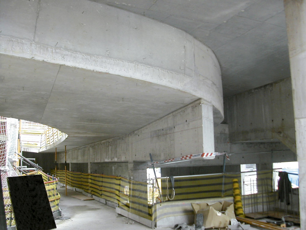 Para solucionar la ejecución de los muros, se aplicó el Encofrado ENKOFORM V-100 en las superficies verticales curvas y en otras inclinadas. Parte de este sistema fue montado in situ, y el resto enviado a obra premontado. Se adaptó a la perfección a las formas diversas de la estructura y a las fuertes presiones de hormigonado.