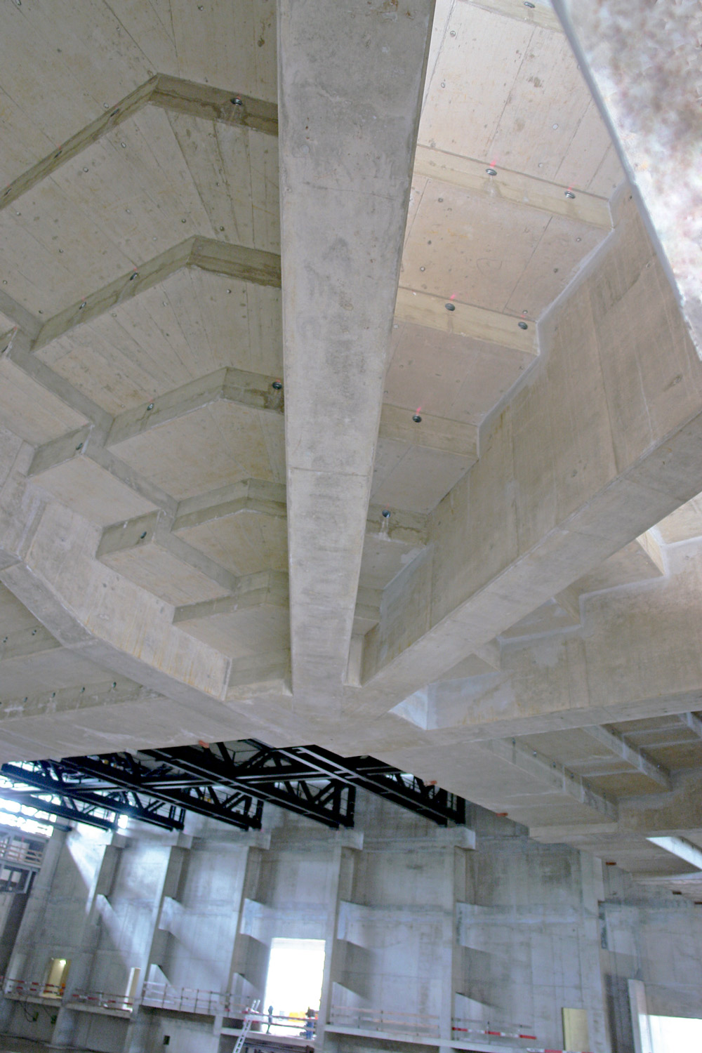 Un edificio de estas magnitudes necesitó del producto más adecuado para cada solución: Encofrado ORMA para la ejecución de muros, Mesas VR para la losa y estructuras de T-60 como sistema de transmisión de cargas. Estos sistemas proporcionaron, en todo momento, el acabado de hormigón visto requerido en obra y su adaptación a las diferentes geometrías.