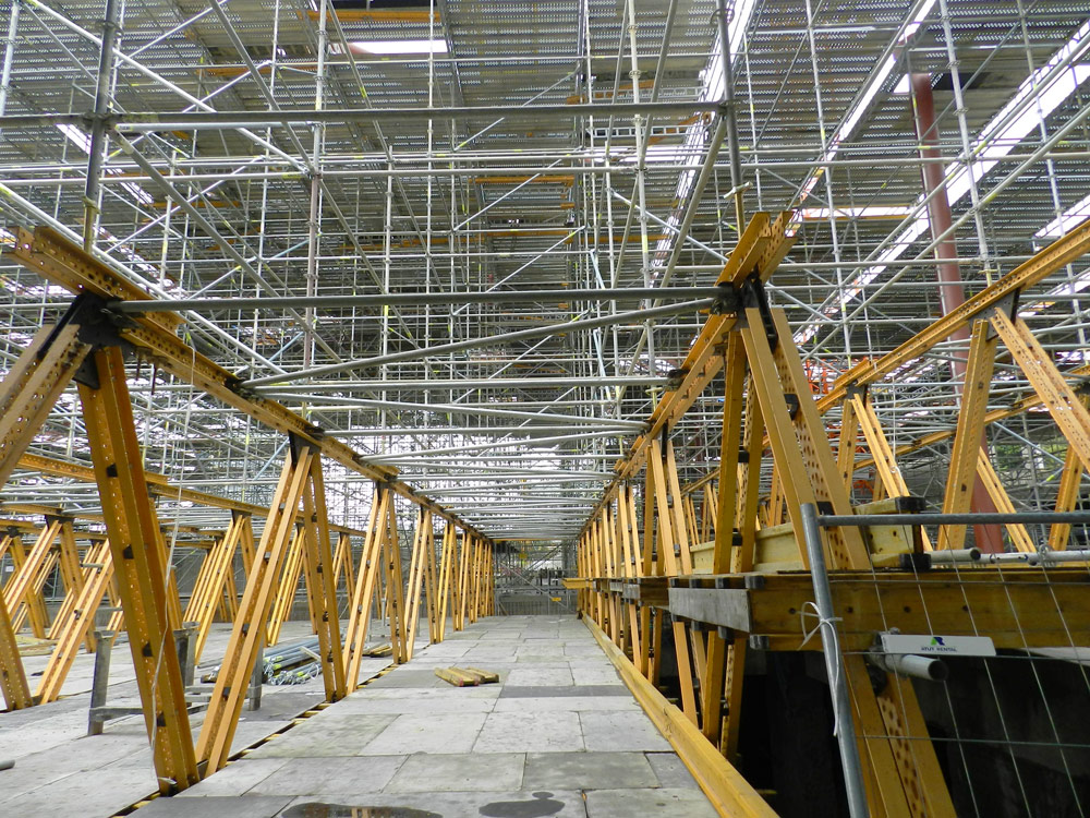 Se ha instalado un conjunto de riostras MK y de puntales EP, sobre la estructura de andamio, como puntos de apoyo para la estructura metálica de la cubierta.