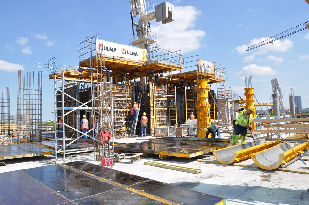 El núcleo del edificio, con dos cajas de escaleras y huecos para los ascensores, se ha construido con dos sistemas autotrepantes. Para las escaleras se han utilizado las consolas autotrepantes ATR-B y para los dos huecos de los ascensores las plataformas ATR-P. Ambos soluciones diseñadas con el sistema MK.