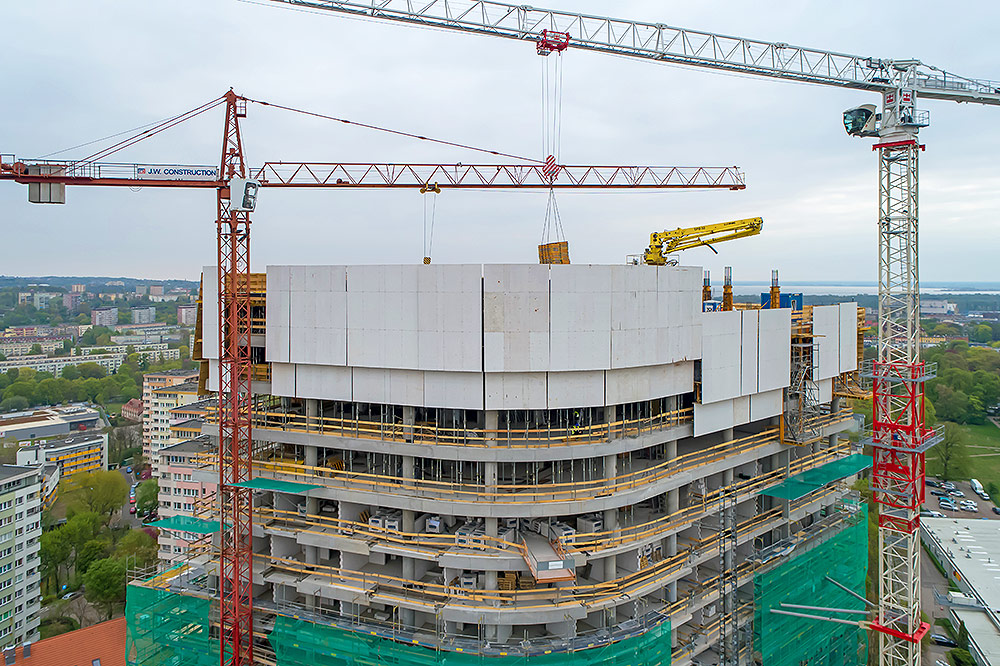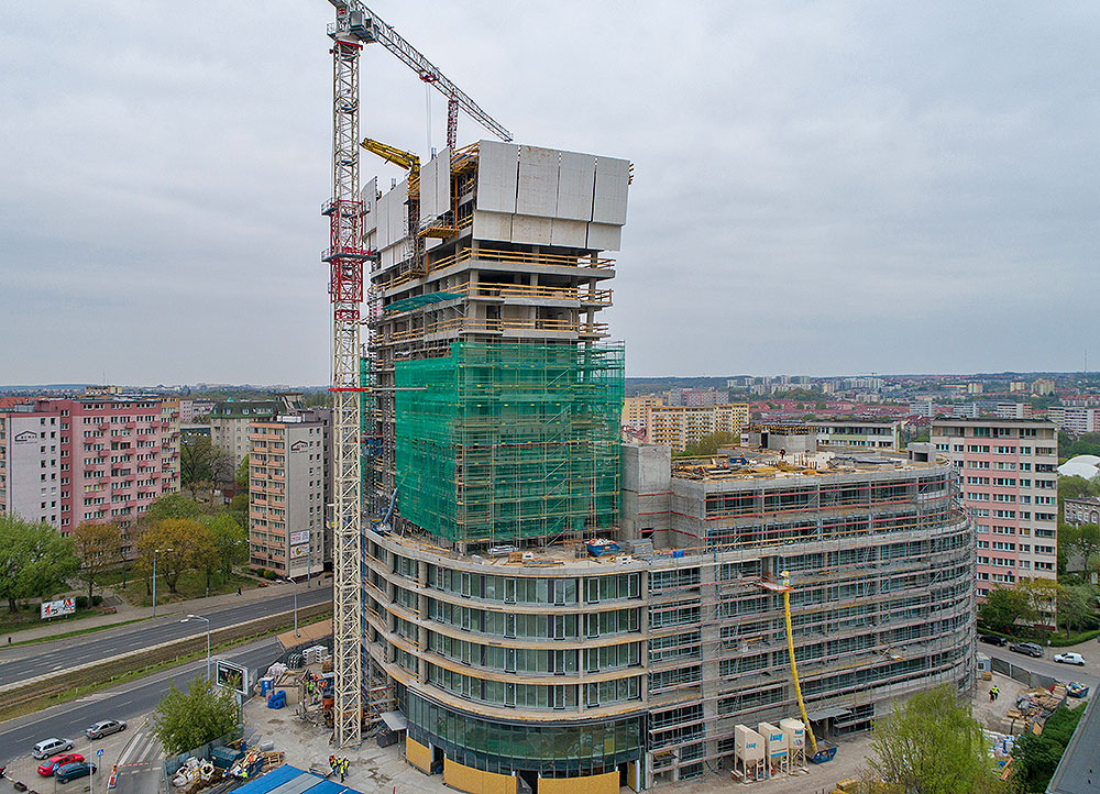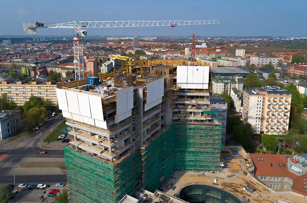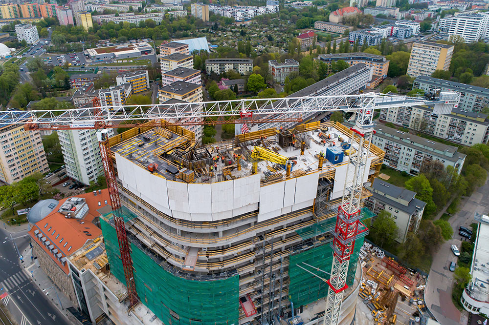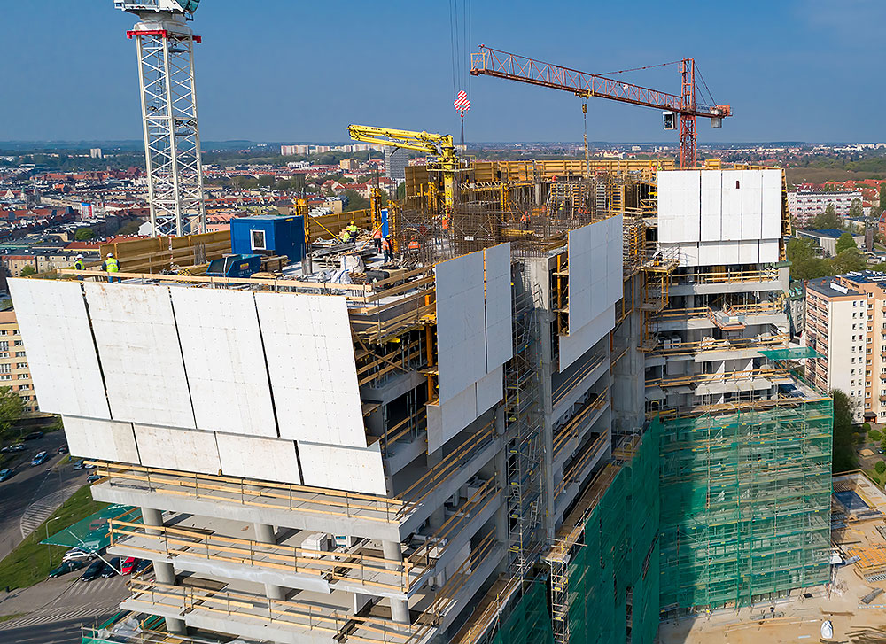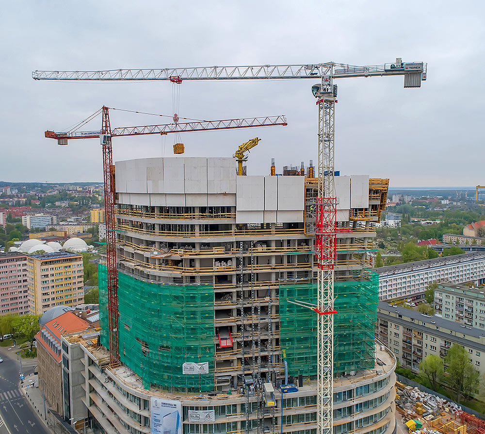 Como es habitual en este tipo de proyectos, la construcción de la Torre Hanza que alcanzará cerca de 100 m, ha requerido de las pantallas de protección perimetral HWS basadas en el sistema MK que ofrecen una gran flexibilidad y adaptación a todo tipo de geometrías y configuraciones.