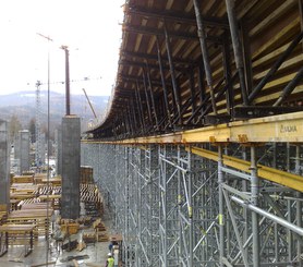 Como encofrado del tablero se empleó el sistema ENKOFORM HMK, adaptable a cualquier sección con piezas estándares. Como apoyo, la Cimbra T-60 agilizó el proceso constructivo además de transmitir las cargas con total seguridad, a más de 15 m de altura.