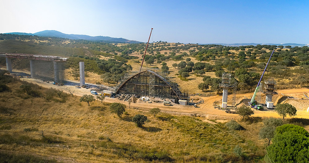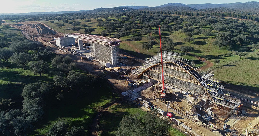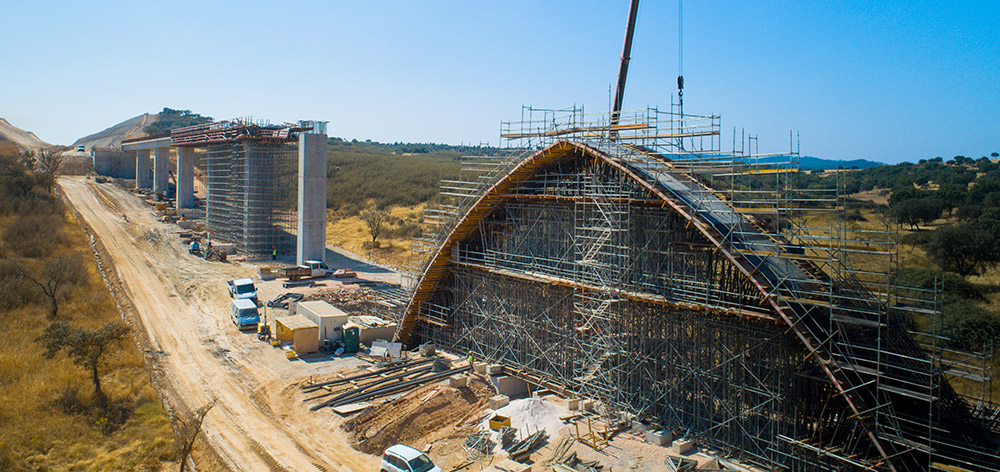 El tramo Freixo - Alandroal consta de 10 viaductos y 16 pasos superiores. Además de suministrar gran cantidad de equipos, el rendimiento ha ido de la mano de la seguridad. En la construcción de los respectivos tableros se ha suministrado 20.000 m³ de cimbra OC y alrededor de 4.000 m² de encofrado ENKOFORM. Colocamos 3.600 m² de encofrado ORMA y 10 conjuntos de encofrado para pilares y zapatas combinando ENKOFORM y ORMA, así como 280 metros de escalera y 10.500 m² de andamio BRIO.