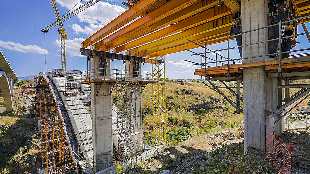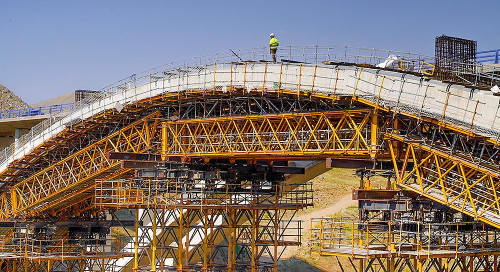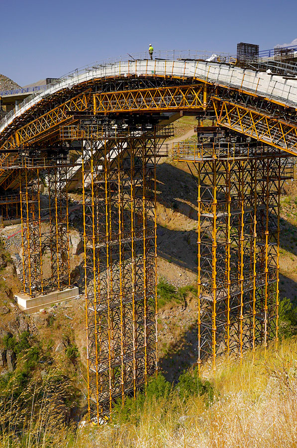 En el arco, ULMA ha propuesto una solución de cimbra porticada sobre zapatas para salvar un terreno escarpado y con pendiente. La geometría del arco se ha conseguido colocando cerchas H-33, de 20 m de longitud, con un doble encofrado.