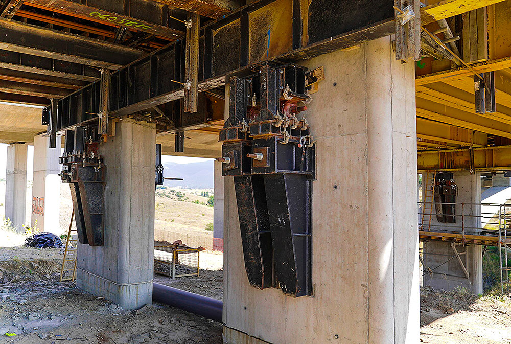 A lo largo del proyecto, los servicios técnicos de ULMA y el cliente han trabajado en equipo para optimizar cada solución con vistas a ahorrar material y reducir coste. Al existir poca distancia entre las pilas, la solución del tablero ha consistido en un sistema de martillos ubicados en la coronación de las pilas sobre los que se ha apoyado directamente el encofrado. Así, la propia pila ha realizado la función de cimbra, evitando tener que acondicionar el terreno para montar un apeo en el suelo.