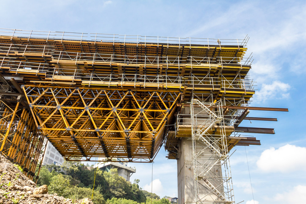 Las pilas rectangulares huecas con chaflán interior, se ejecutan mediante ENKOFORM V-100 y Consolas CR-250 con altura de paños de 5m. Una vez ejecutadas las pilas se monta la cimbra porticada con Cimbra OC y perfilería los tres primeros pórticos, y con Cimbra MK y Cercha MK el pórtico 4 del vano ESTRIBO 1 – PILA 2.