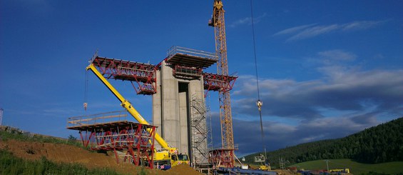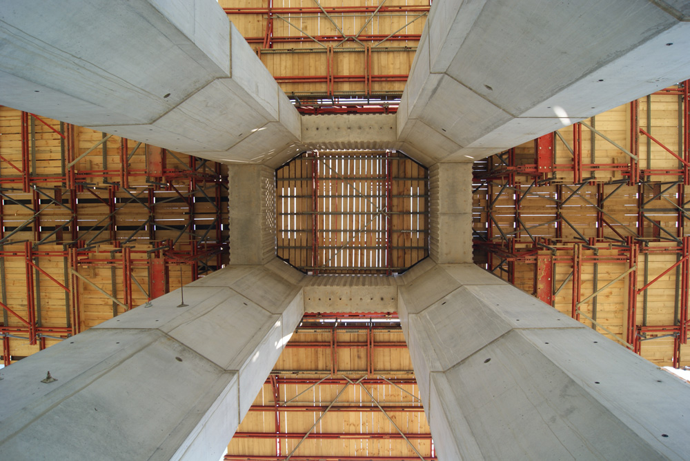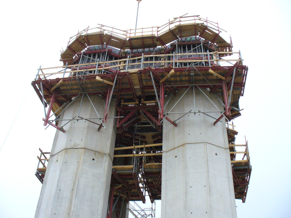 Tanto las pilas, los estribos, como la dovela cero se han construido con encofrado modular basado en la tecnología de MK. Como estructura de soporte para realizar el muro de refuerzo se han planteado las consolas de gran carga MK que, al igual que el sistema de trepado, se han adaptado a la forma de las pilas.