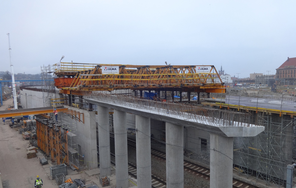 La construcción de la losa superior del túnel sobre las líneas férreas se ha realizado combinando productos: cerchas MK y perfiles TAC 1200. Los perfiles metálicos han cubierto vanos de 12 m mientras que las cerchas fijas dependiendo del vano a cubrir variaban de 15 a 33 m de longitud y dos alturas de 3 a 6 m, y las cerchas móviles de 30 m de longitud y 6 m de altura. Ambos sistemas se han apoyado sobre vigas HEB-400 colocadas en vertical sobre el muro. Para realizar el montaje en las cerchas se crearon espacios de trabajo combinando varios productos de ULMA: plataformas metálicas, riostras MK, sistema VR y vigas VM.