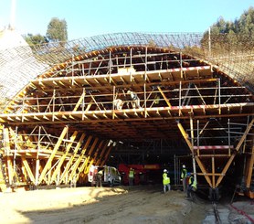 Y por último un sistema de carro de encofrado MK para permitir el hormigonado del túnel. Con un mismo carro es posible realizar distintas geometrías en un mismo túnel; de ahí que se haya empleado en este caso ya que consta de cuatro secciones tipo en las que varía el fondo de la sección. Además, está solución ha contemplado el paso de vehículos, necesario en este tipo de proyectos.