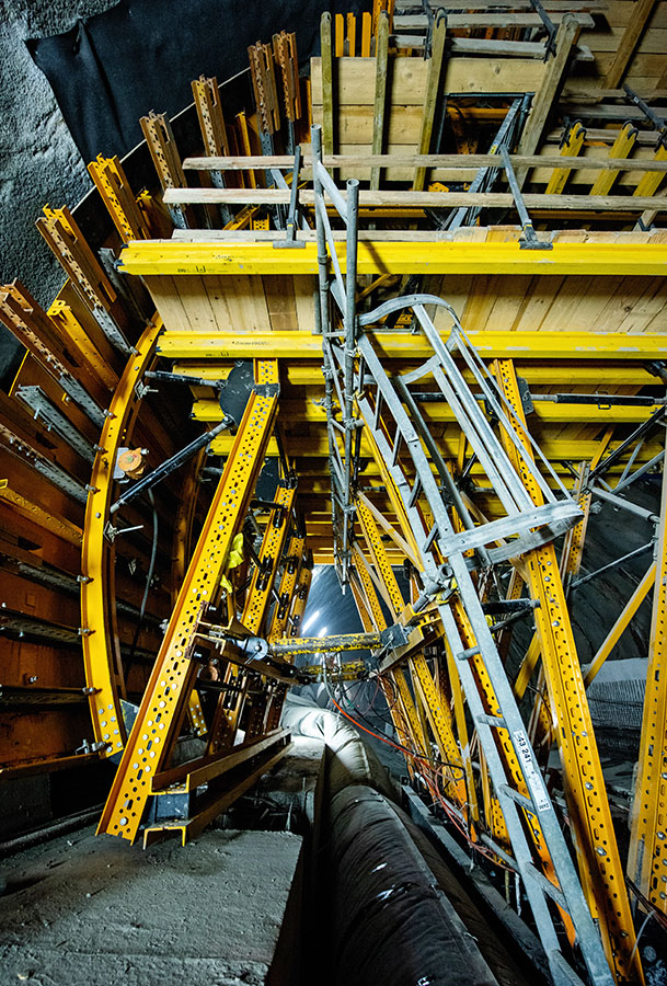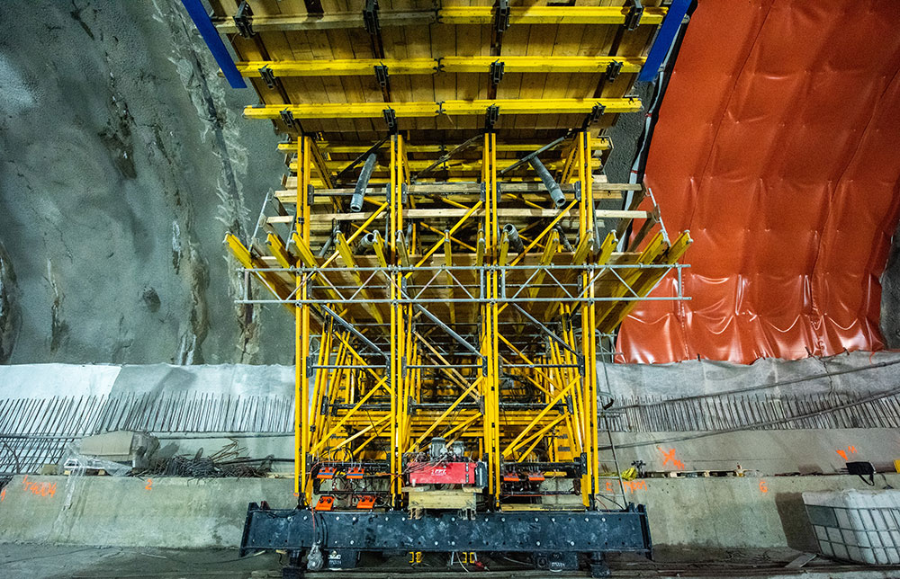 El equipo de ingeniería de ULMA ha diseñado un carro de encofrado MK de 15,5m de ancho y 10,7 m de longitud para el hormigonado del túnel. Con el empleo de un solo producto basado en piezas estándares MK, el carro se ha adaptado a la geometría compleja del túnel. Para la zona de la cornisa, se diseñó un panel especial que ha permitido el soporte de las cargas durante el hormigonado y un desencofrado eficiente sin la necesidad de uso de los sistemas hidráulicos. Además, con el empleo de paneles de encofrado TMK se han obtenido excelentes acabados de hormigón. El carro además de una gran capacidad portante ha dispuesto de plataformas de trabajo, escaleras de acceso y otros elementos de seguridad integrados.