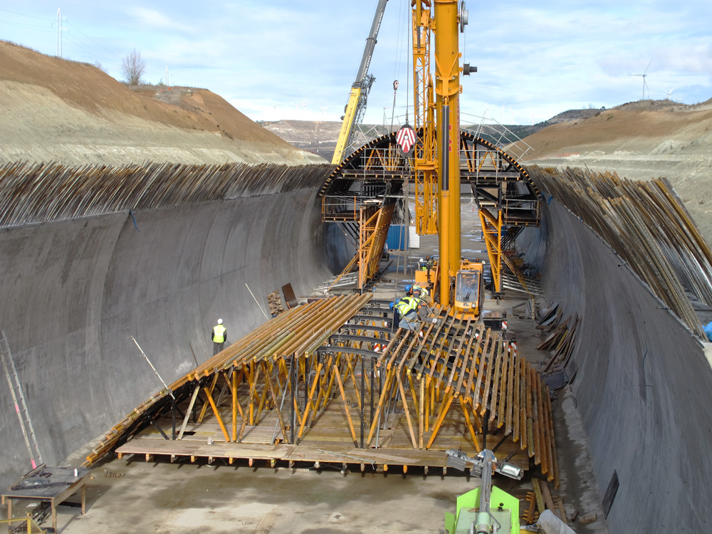 Pese al terreno arcilloso, la solución cumplió el plazo marcado, gracias a una planificación detallada del suministro y el montaje. El área de ingeniería de ULMA proyectó dos carros ligeros para desplazar una gran superficie de encofrado con los medios auxiliares existentes en obra. Los sistemas de rodadura permitieron la ejecución en tramos de 12,5 m de la sección completa del túnel, sin alterar la configuración del carro. Tras el estudio técnico, ULMA consideró que la mejor forma de optimizar este proyecto era partiendo de la zona central del túnel. Desde aquí, ambos carros avanzaron en sentido opuesto hacia cada extremo para ejecutar la bóveda, al tiempo que se encofraban los hastiales. El trabajo sincronizado supuso un gran ahorro de tiempo en cada tramo. Con un mismo producto, ENKOFORM, se obtuvieron las geometrías curvas de la bóveda y de los hastiales.