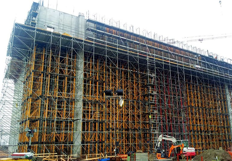 El muro, que alcanzará una altura de 40 m, y los contrafuertes de la planta se han construido con el encofrado modular ORMA apoyados en consolas de trepado BMK ancladas en el hormigonado previo.