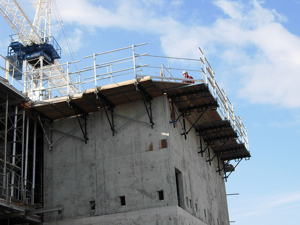 La construcción de edificios de gran altura, requiere sistemas de seguridad como la protección perimetral HWS basada en el sistema MK que ofrece una gran flexibilidad y adaptación a todo tipo de geometrías y configuraciones. Este sistema de cierre tiene como objetivo la protección de todo el perímetro del edificio en construcción evitando la caída al exterior mediante la ubicación de las pantallas protectoras tanto en la planta donde se está ejecutando el encofrado como en las dos plantas inmediatamente inferiores. A medida que la obra avanza en altura, las pantallas van subiendo de nivel, mediante la utilización de grúa o un sistema hidráulico. Este sistema de seguridad ofrece además una excelente protección contra inclemencias meteorológicas y evita a los trabajadores el efecto de vértigo provocado por la visualización de la altura.