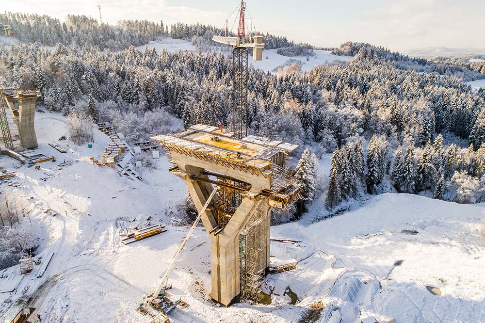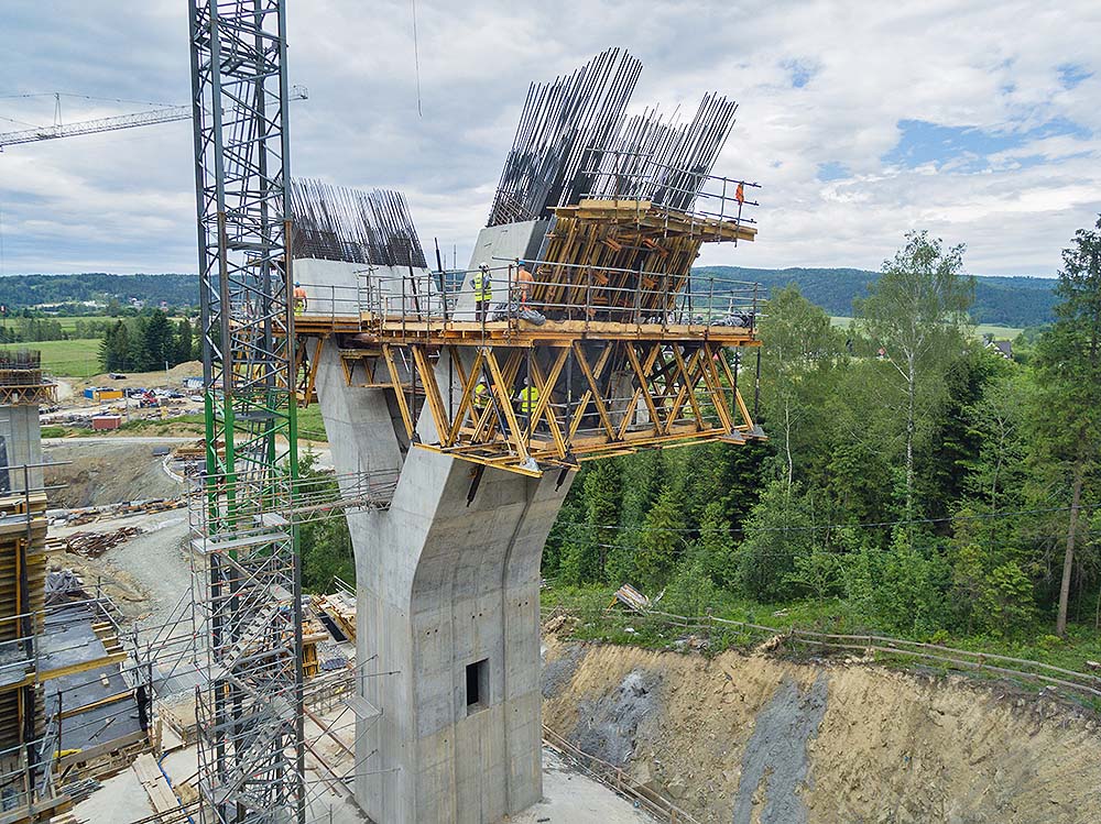 Las pilas en forma de “Y” se han ejecutado en tres fases. Los fustes, de sección rectangular hueca, se han realizado en tongadas de 4,56 m con el sistema de vigas VMK sobre consolas de trepado configurables BMK. En la base del capitel, donde arrancan los brazos de la Y, se ha empleado, además de consolas BMK, el encofrado a una cara UCAB-EUC. Este conjunto ha permitido generar una superficie de apoyo para el encofrado de muro de 6,40 m de altura. El último tramo de estructuras inclinadas se ha realizado con el sistema autotrepante ATR y la consola BMK capaz de adaptarse al ángulo de inclinación predeterminado. La estructura del sistema autotrepante se ha conformado con cerchas MK y un único juego de cilindros hidráulicos ubicados en la cara exterior de los brazos del fuste.
